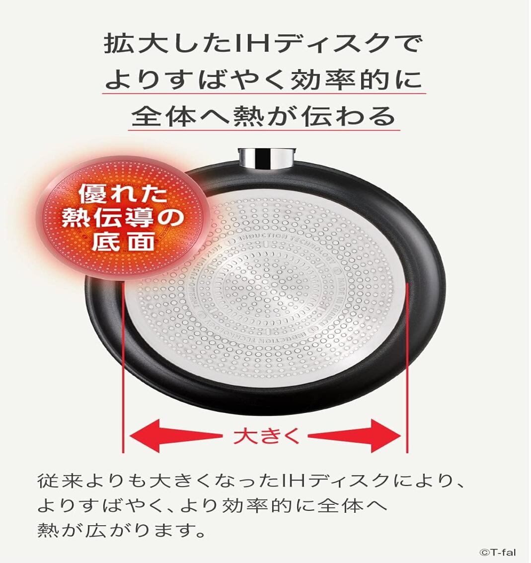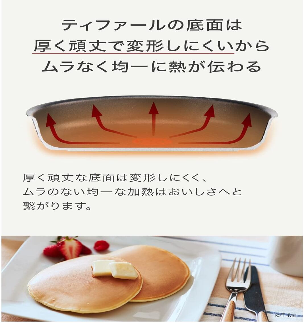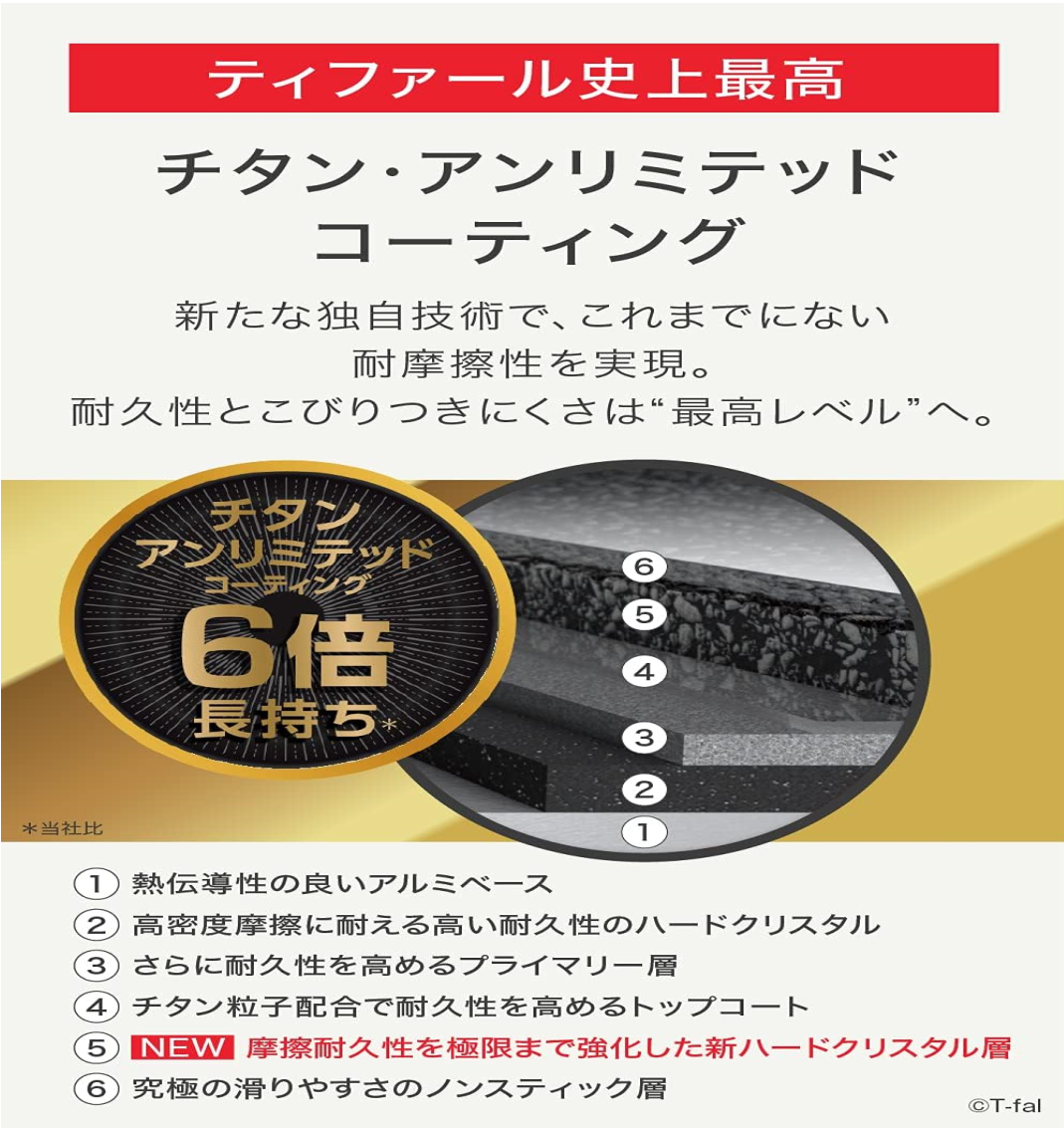 素材・材質:本体/アルミニウム合金、底/アルミニウム合金+ステンレス鋼(クロム16%)、取っ手/フェノール樹脂、加工/チタン・アンリミテッド(内面)・ふっ素樹脂塗膜加工(外面)、生産国:フランス